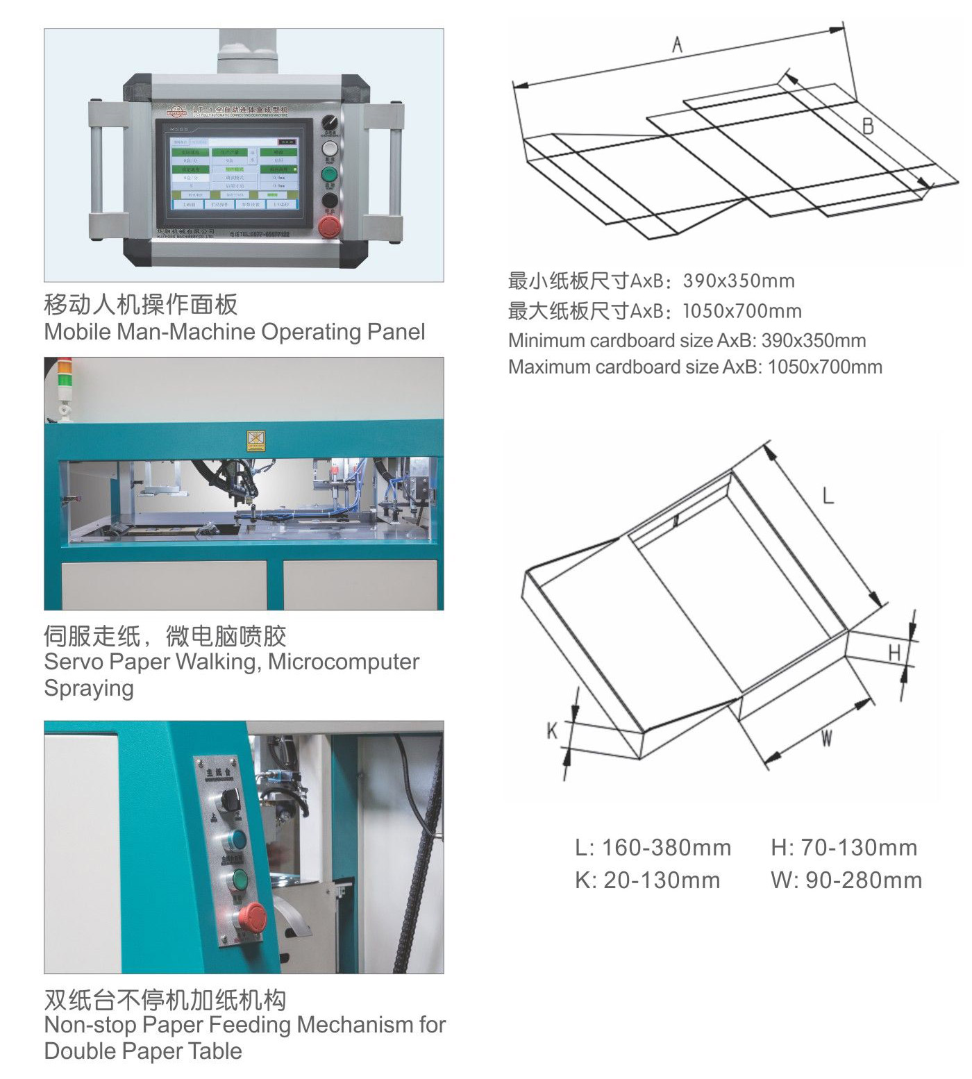 全新的送紙工藝保證不同規(guī)格紙板順利送入;采用高速噴膠系統(tǒng)上膠方式和自動疊盒捆綁系統(tǒng),體現(xiàn)本設(shè)備的高效和對產(chǎn)品工藝的完美追求。